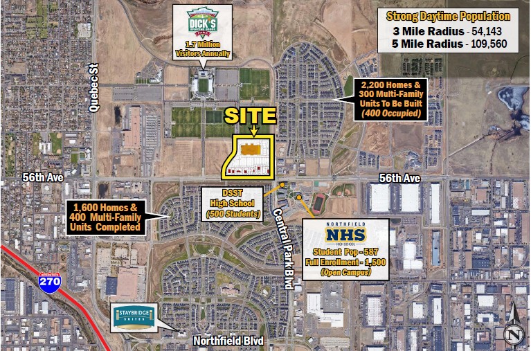 - Prominent intersection of 56th Avenue & Central Park Boulevard, next to Dicks Sporting Goods Park and Northfield High School.